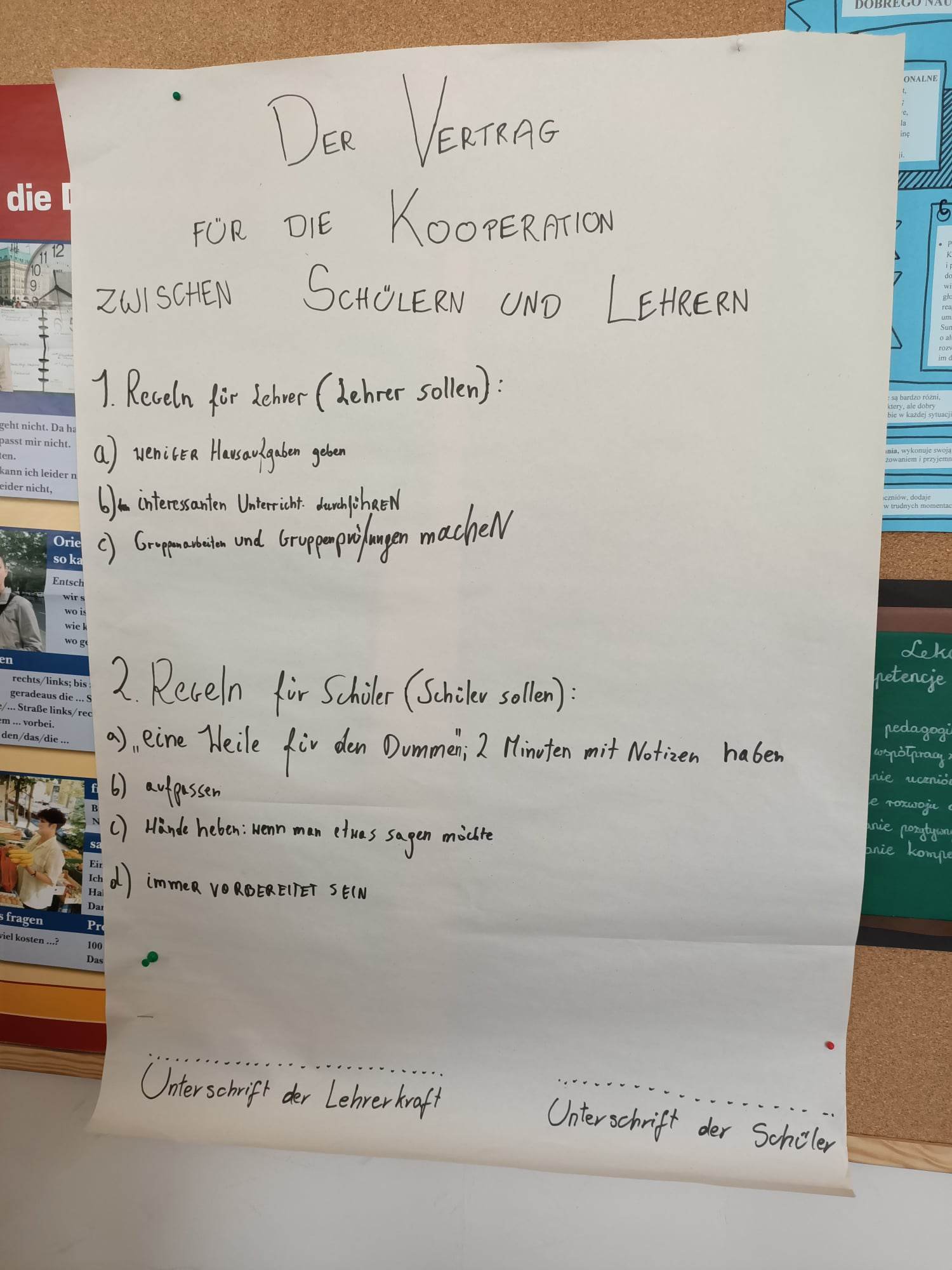 Celem zajęć było przygotowanie przez uczniów umowy dotyczącej wzajemnej współpracy, którą mogliby podpisać z nauczycielem języka niemieckiego. [MK]
