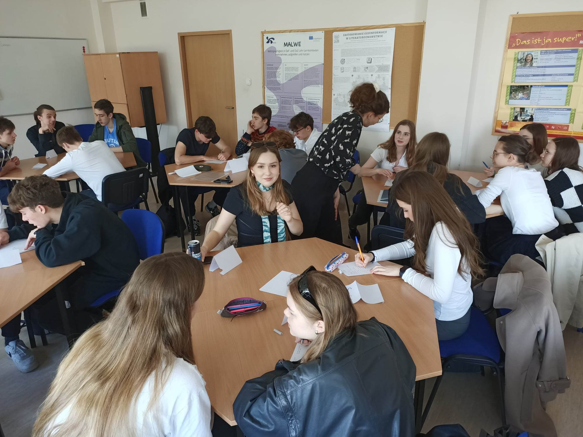 21 kwietnia klasa 2E wraz z Panią Profesor Kraśnik wzięła udział w projekcie niemieckojęzycznym na Uniwersytecie UAM w Instytucie Filologii Germańskiej. Warsztaty pt.„Schummeln in der Schule” odbyły się „pod okiem” pani lektorki DAAD mgr Karoliny Toledo-Flores”. Na początku rozmawialiśmy na forum, każdy z nas przedstawił swoje zdanie na temat „ściągania” w szkole. W grupach stworzyliśmy plakaty, które następnie omawialiśmy. Podczas zajęć mieliśmy możliwość w innowacyjny sposób rozwinąć nasze umiejętności językowe.