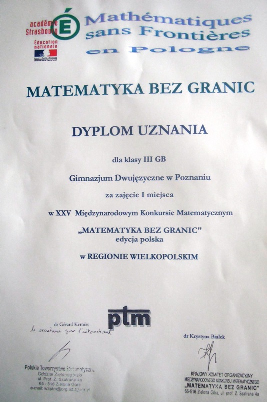 W bieżącym roku szkolnym w „Matematyce bez granic” uczestniczyły dwie klasy z naszej szkoły – klasa 3ga i 3gb.