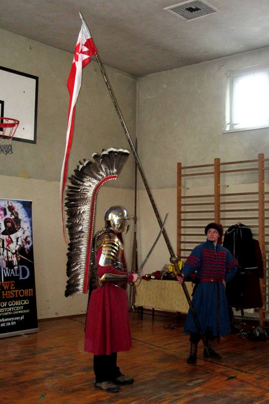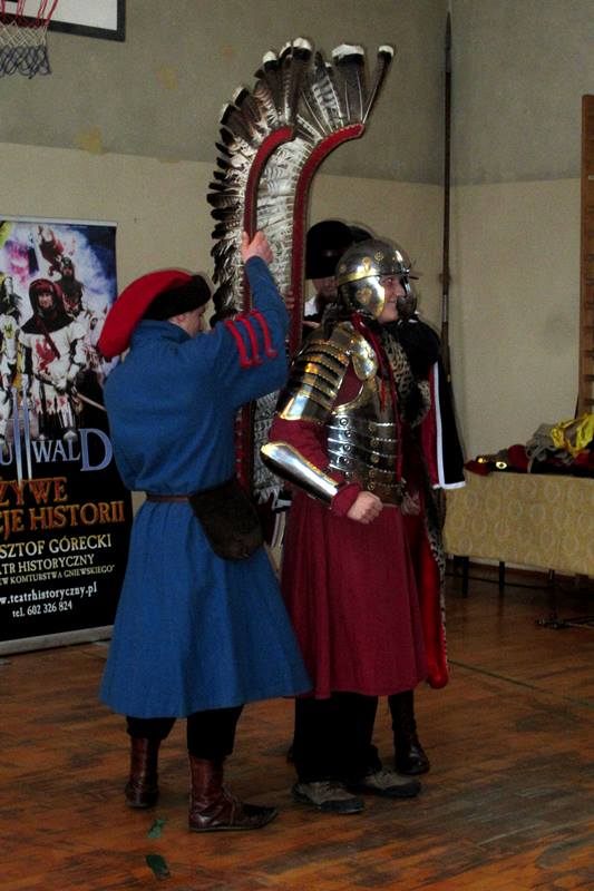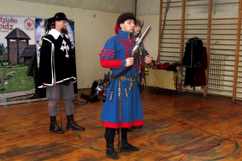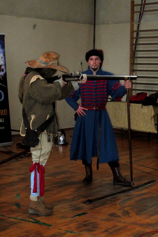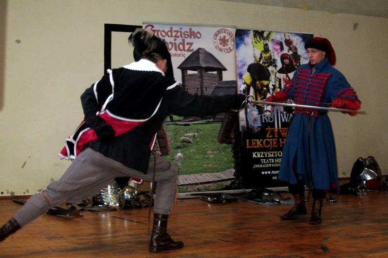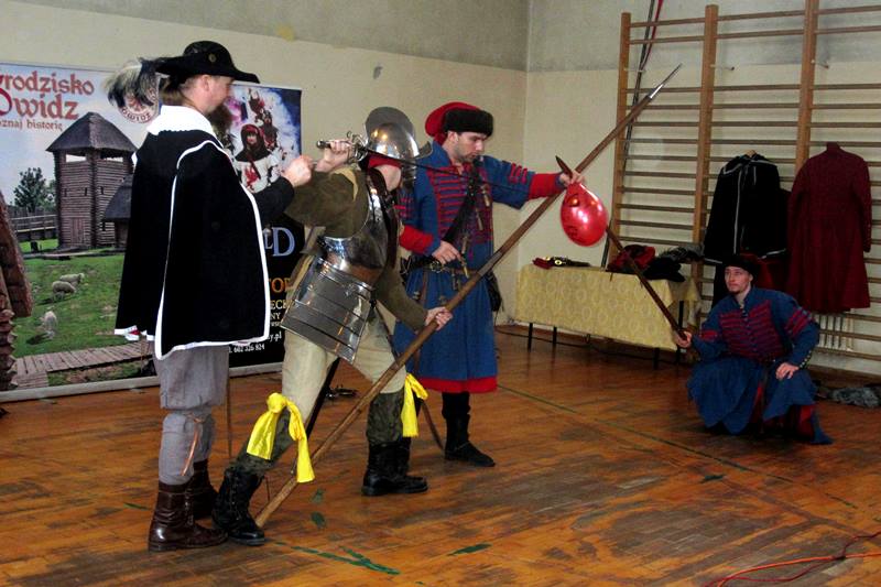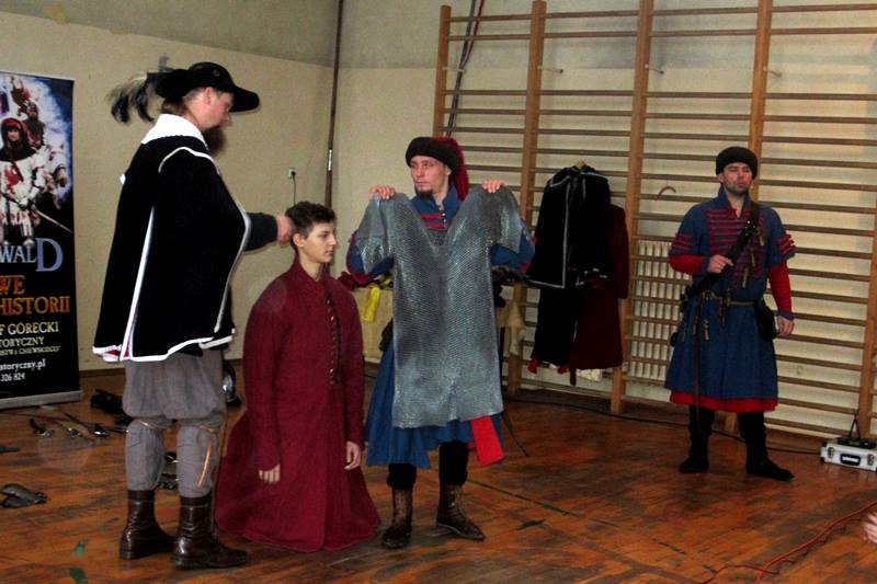 Uczniowie mogli ubrać żupan, kontusz oraz uzbrojenie kawalerii i piechoty: „pancernego”, pikiniera, muszkietera, a także przymierzyć zbroję husarską. Obejrzeli także pokaz walki szablą oraz rapierem w wykonaniu rycerzy Chorągwi. [M.D-R.]