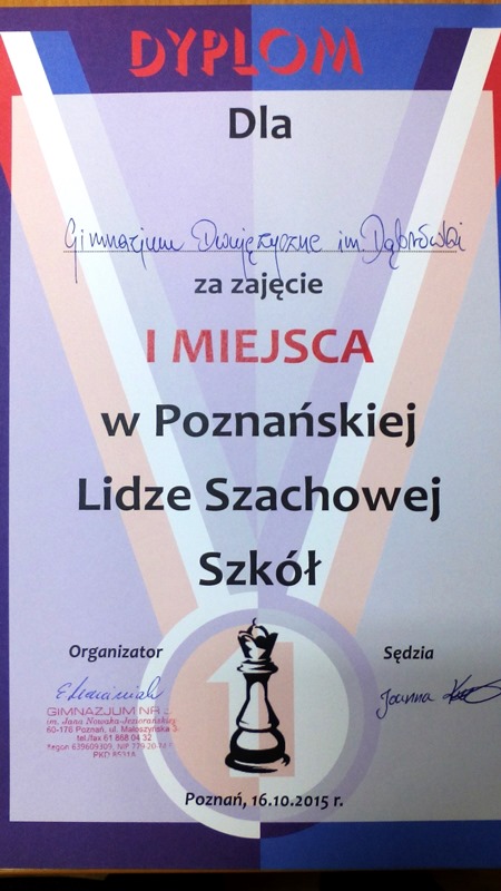 W piątek 16 października 2015 r. reprezentacja Gimnazjum Dwujęzycznego im. Dąbrówki w składzie Antonina Pogorzelczyk i Mikołaj Nowak 1ga, Józef Bugajewski 1gb i Bruno Rusche z 3ga wygrała pierwszy turniej organizowany w ramach Poznańskiej Ligi Szachowej.