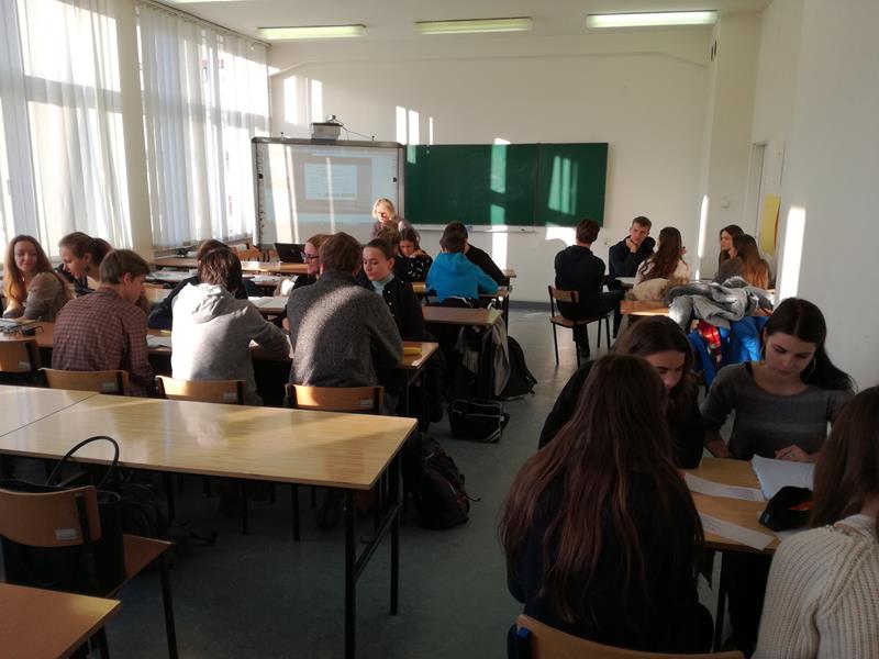 Wspólnie pracowaliśmy w pięcioosobowych grupach. Grupy musiały zapoznać się z ostatnimi wydarzeniami w Ełku, opanować związane z nimi słownictwo, a następnie przygotować na ten temat wypowiedź ustną po niemiecku, aby móc później wziąć udział w dyskusji. Dotyczyła ona tematyki uchodźców i tolerancji wobec innych narodów, zastanawialiśmy się, co może powodować niechęć między różnymi narodami. Pojawiło się ważne pytanie: jaką powinno przyjąć się postawę kiedy ma się do czynienia z nacjonalizmem?