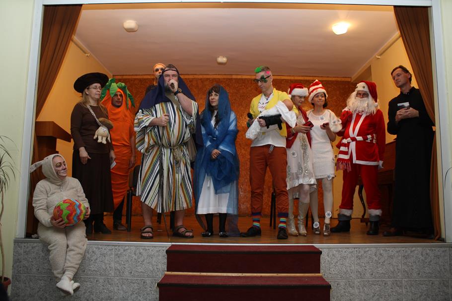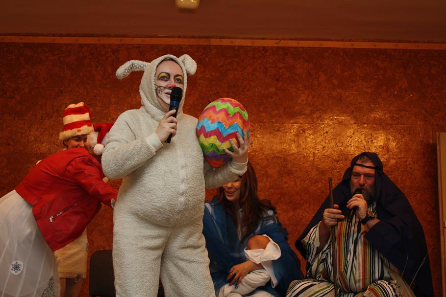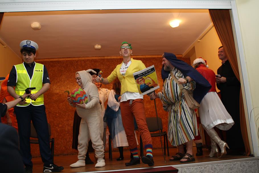 Święta Rodzina spotkała się na scenie z bohaterami komercyjnej kultury popularnej: Gwiazdorem i Śnieżynkami, Królikiem Wielkanocnym, Księdzem, Gangiem Świeżaków, Hellowenową Dziewczynką i Feministką. Trochę wszystkich zaskoczyła interwencja Policjantów, którzy wylegitymowali Pana Dyrektora i podjęli próbę spacyfikowania „nielegalnego zgromadzenia”.