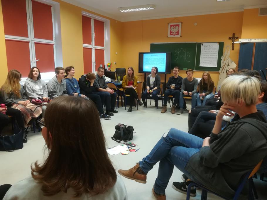 Warsztaty z p. Anną Karoliną Kłys w ramach Szkoły Myśli Krytycznej pt. „Propagandowa dehumanizacja jako proces” (mowa nienawiści, wiarygodność informacji), pisarką, autorką m. in. literackich reportaży „Tajemnica Pana Cukra” oraz „Brudne serca” (III A).