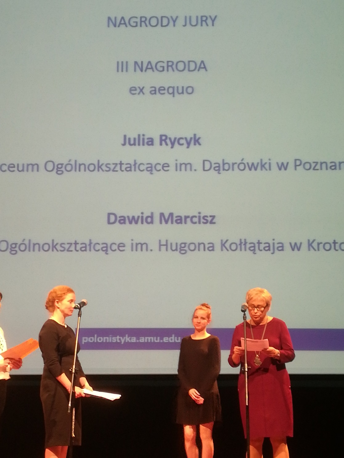 W XII Edycji Konkursu Literackiego o Nagrodę FanFila organizowanego przez Wydział Filologii Polskiej na UAM w Poznaniu Julia Rycyk z kl. I B zdobyła ex aequo III miejsce w kategorii przekład. Pod opieką p. prof. Renaty Ayeb tłumaczyła opowiadanie Joan Aiken pt. "Prelude" z tomu "The Serial Garden". Gala wręczenia nagród odbyła się w C.K. Zamek i uświetniło ją spotkanie z poetą Marcinem Świetlickim.