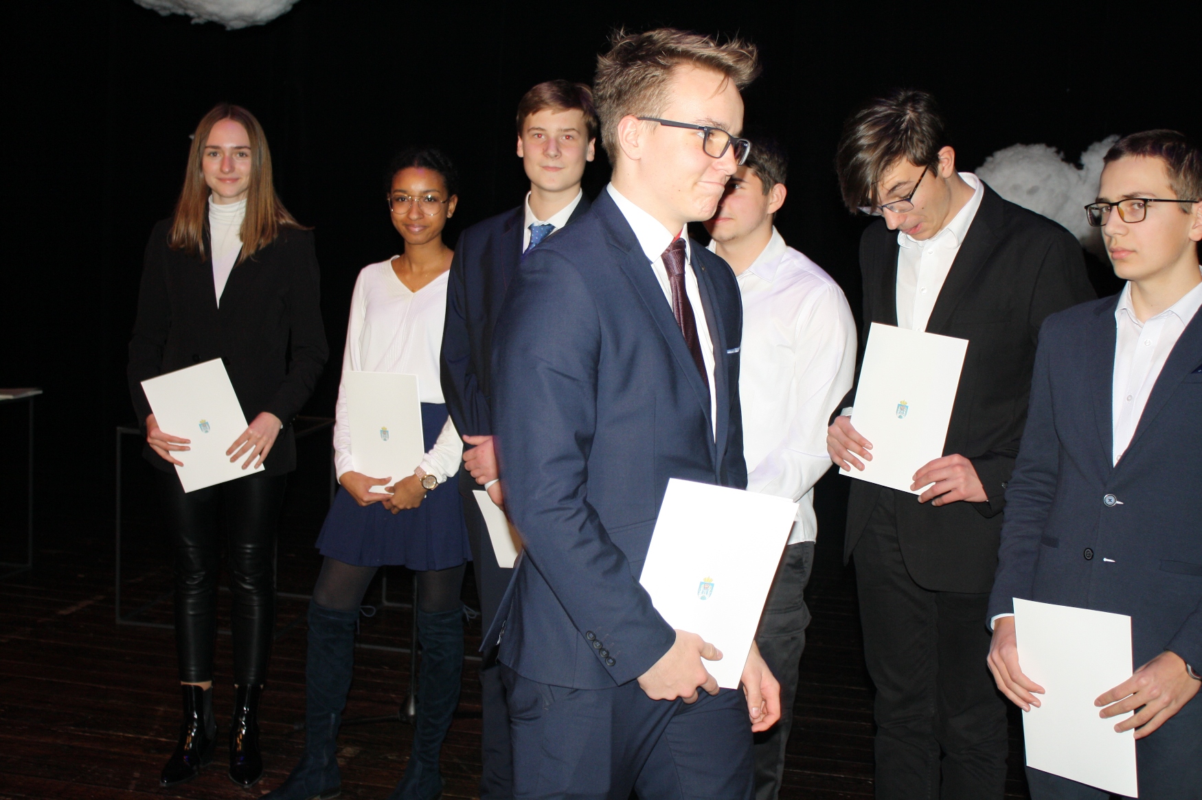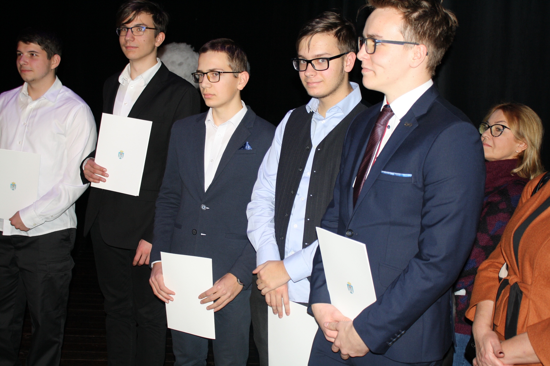 Uczniowie klas licealnych otrzymali nagrody za sukcesy olimpijskie: Julia Bednarek (laureat olimpiady języka niemieckiego), Mateusz Gajewski (finalista olimpiady fizycznej) oraz Patryk Morawski (finalista olimpiady matematycznej.