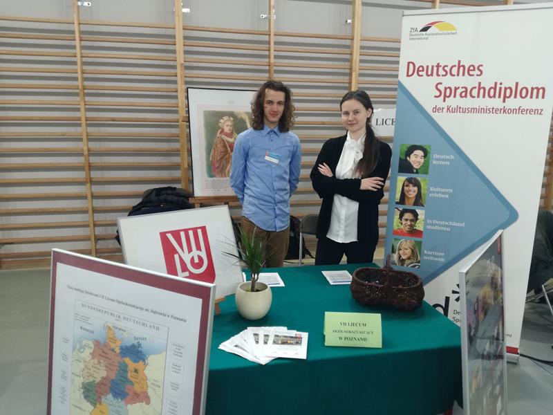 Opowiadaliśmy o nauce w Dąbrówce uczniom klas siódmych i ósmych oraz ich rodzicom. Dzięki temu, że w SP 2 w Plewiskach również funkcjonuje klasa dwujęzyczna z językiem niemieckim, spotkaliśmy wiele osób zainteresowanych kontynuacją nauki języka niemieckiego w naszym liceum, a ponieważ ja i Kasia jesteśmy z klasy 2E, wszyscy mogli usłyszeć mnóstwo informacji z pierwszej ręki. Przedstawiliśmy ofertę VII LO dla absolwentów szkół podstawowych, opowiadaliśmy o klasie wstępnej z językiem niemieckim, możliwości rozwijania umiejętności języka niemieckiego w ramach grupy DSD II, rozdawaliśmy ulotki promujące Dąbrówkę i …częstowaliśmy słodkim małym co nieco. [Michał Tuliszkiewicz, kl. 2E]