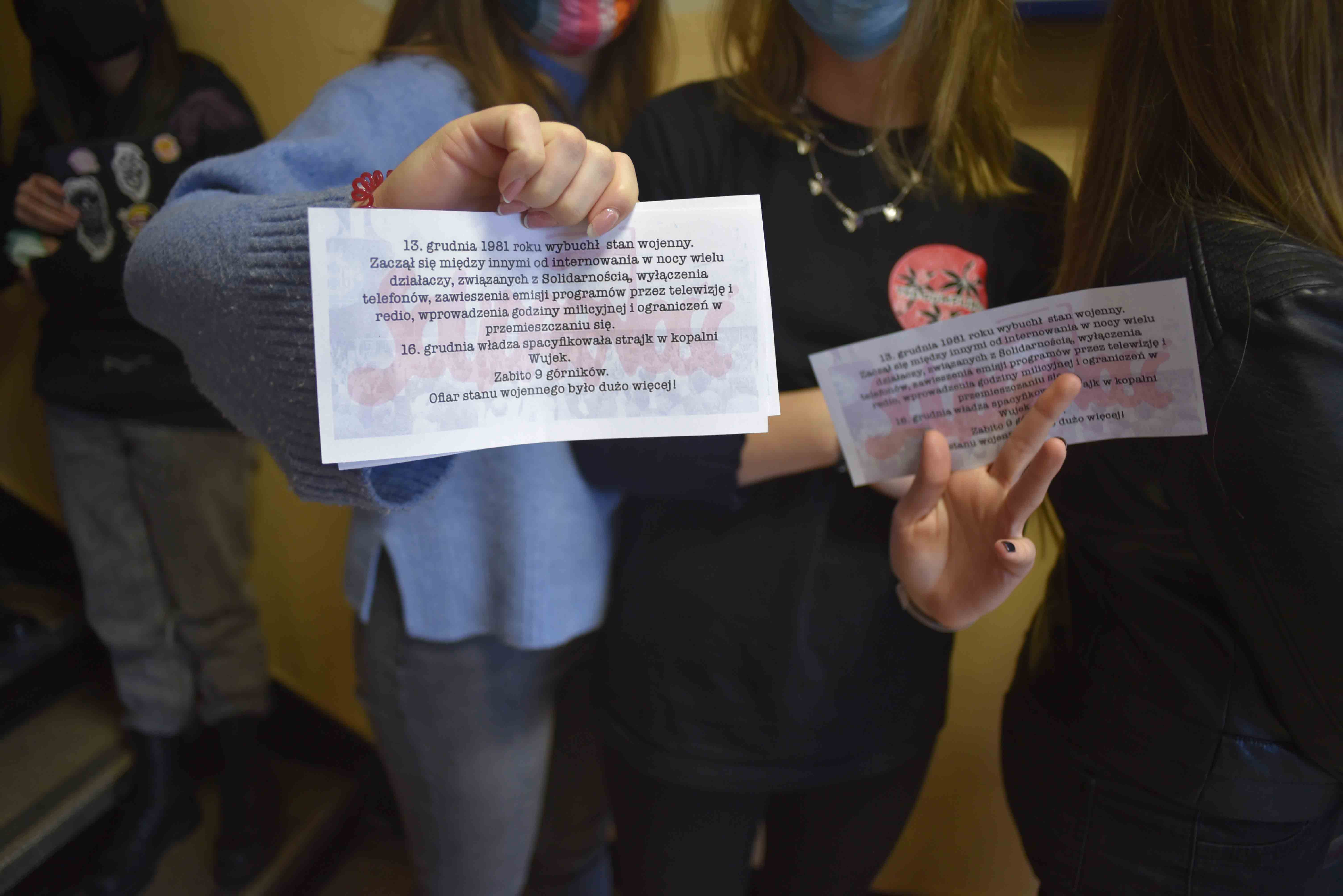 13.grudnia Dąbrówka w dość nietypowy sposób upamiętniła walczących o wolność. Na dużej przerwie pojawili się „robotnicy”, którzy wciskali, wychodzącym z sal uczniom, ulotki … Nagle wybiegli zomowcy i zaczęli gonić i wymachiwać pałkami (całe szczęście papierowymi)…W tle słychać było „Obławę” Kaczmarskiego, okrzyki „ZOMO do domu!”, „swoich chcecie bić!?” Może niektórzy ułamek atmosfery tamtych czasów odczuli…