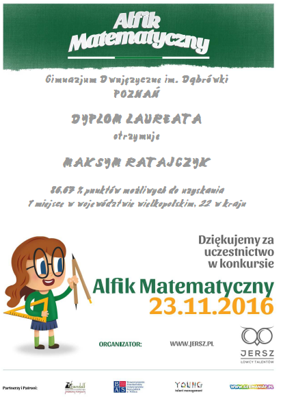 Maksym Ratajczyk z klasy 2ga został laureatem konkursu Alfik Matematyczny, zajmując 1. miejsce w województwie wielkopolskim i jednocześnie 22. miejsce w kraju.