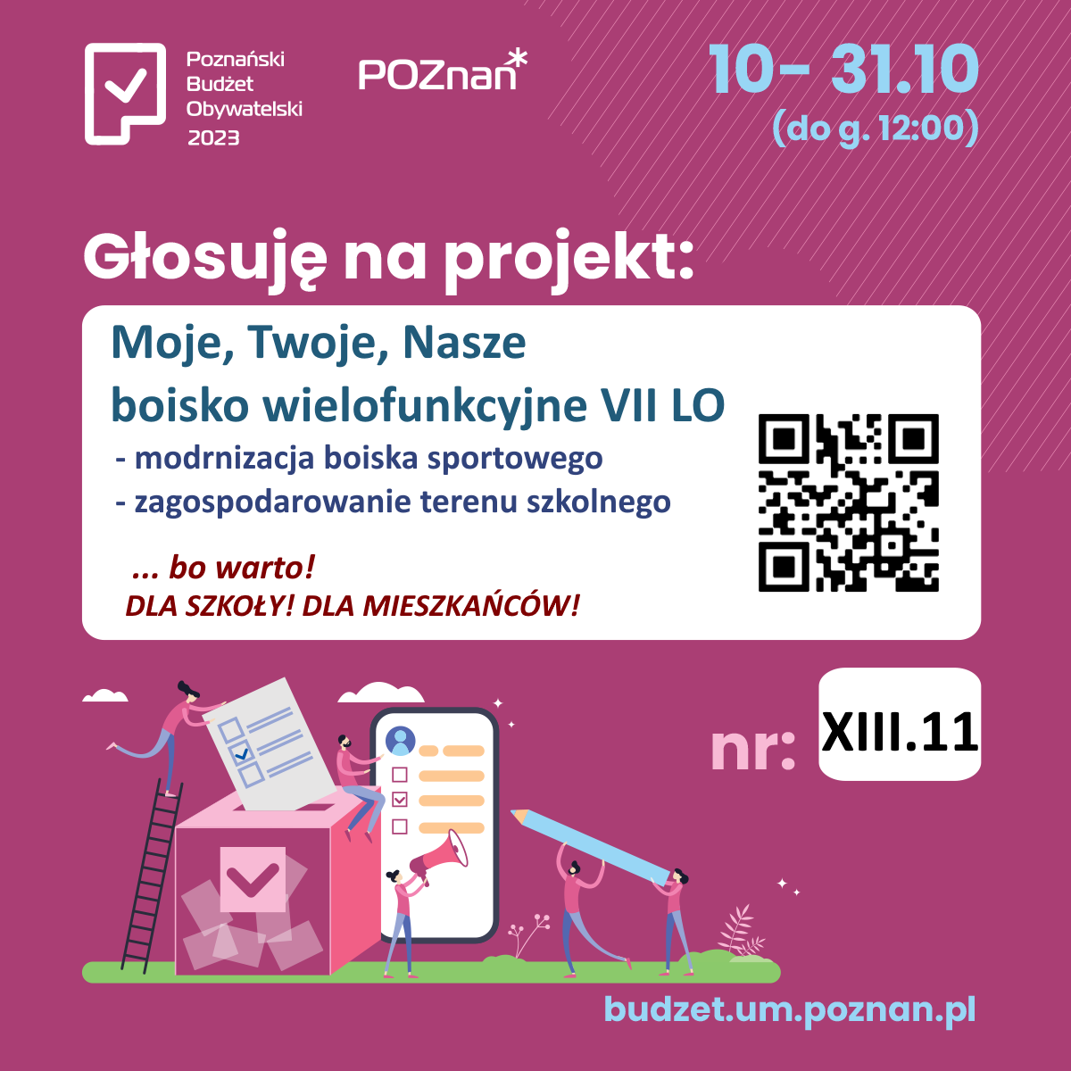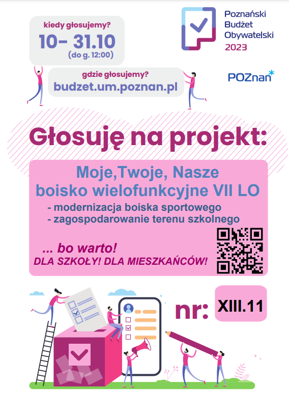 Informujemy, że nasz projekt Moje, Twoje, Nasze boisko wielofunkcyjne VII LO – modernizacja boiska sportowego wraz zagospodarowaniem terenu szkolnego znajduje się pod numerem XIII.11 (jest to projekt rejonowy - Jeżyce, św. Łazarz).