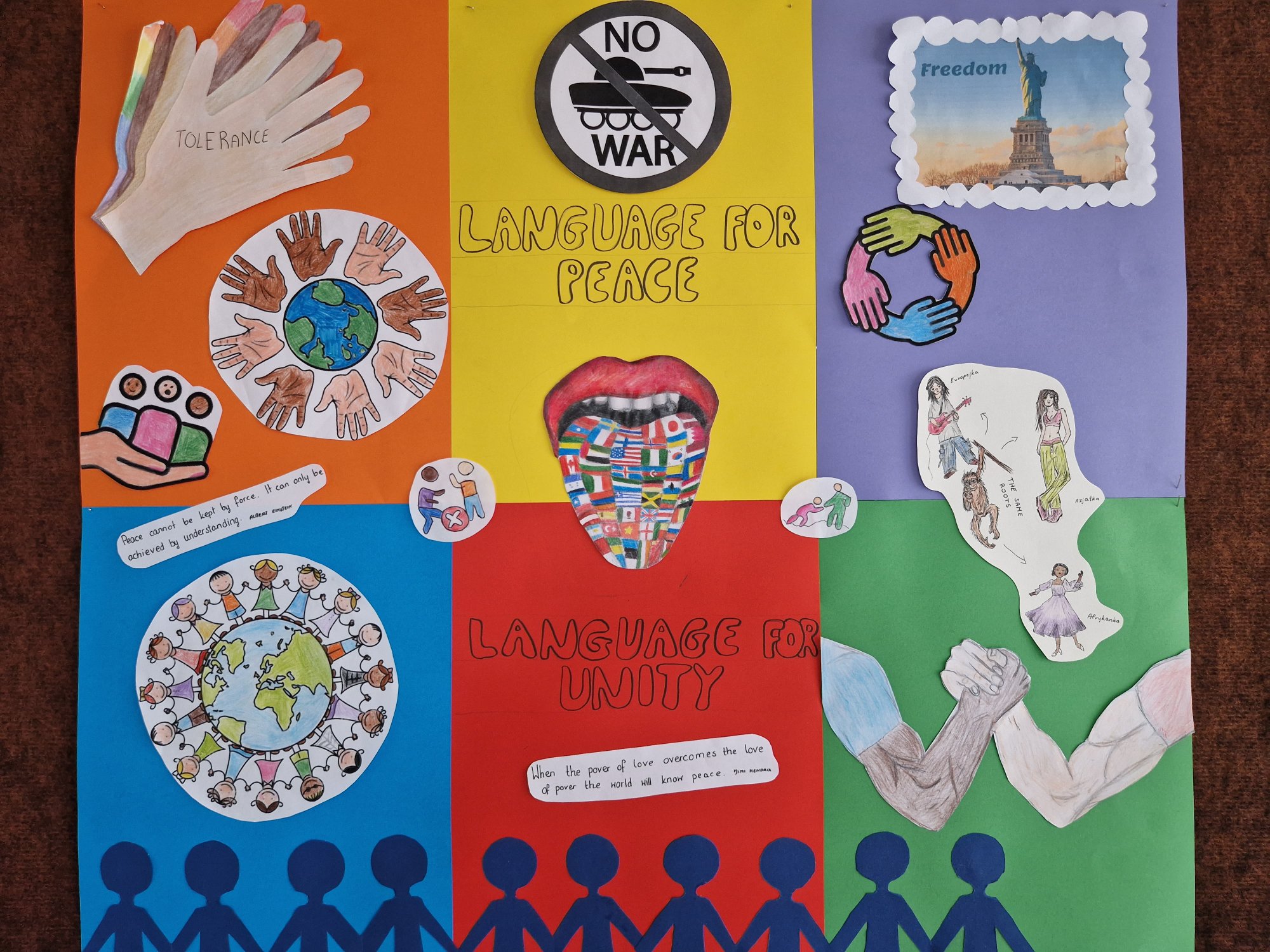Piękne kolorowe prace artystyczne uczniów w temacie "Języki i pokój" oraz "Jedność i Pokój" na zakończenie Europejskiego Dnia Języków. Zadanie dla dociekliwych: w ilu językach pojawia się na nich słowo "pokój"?...