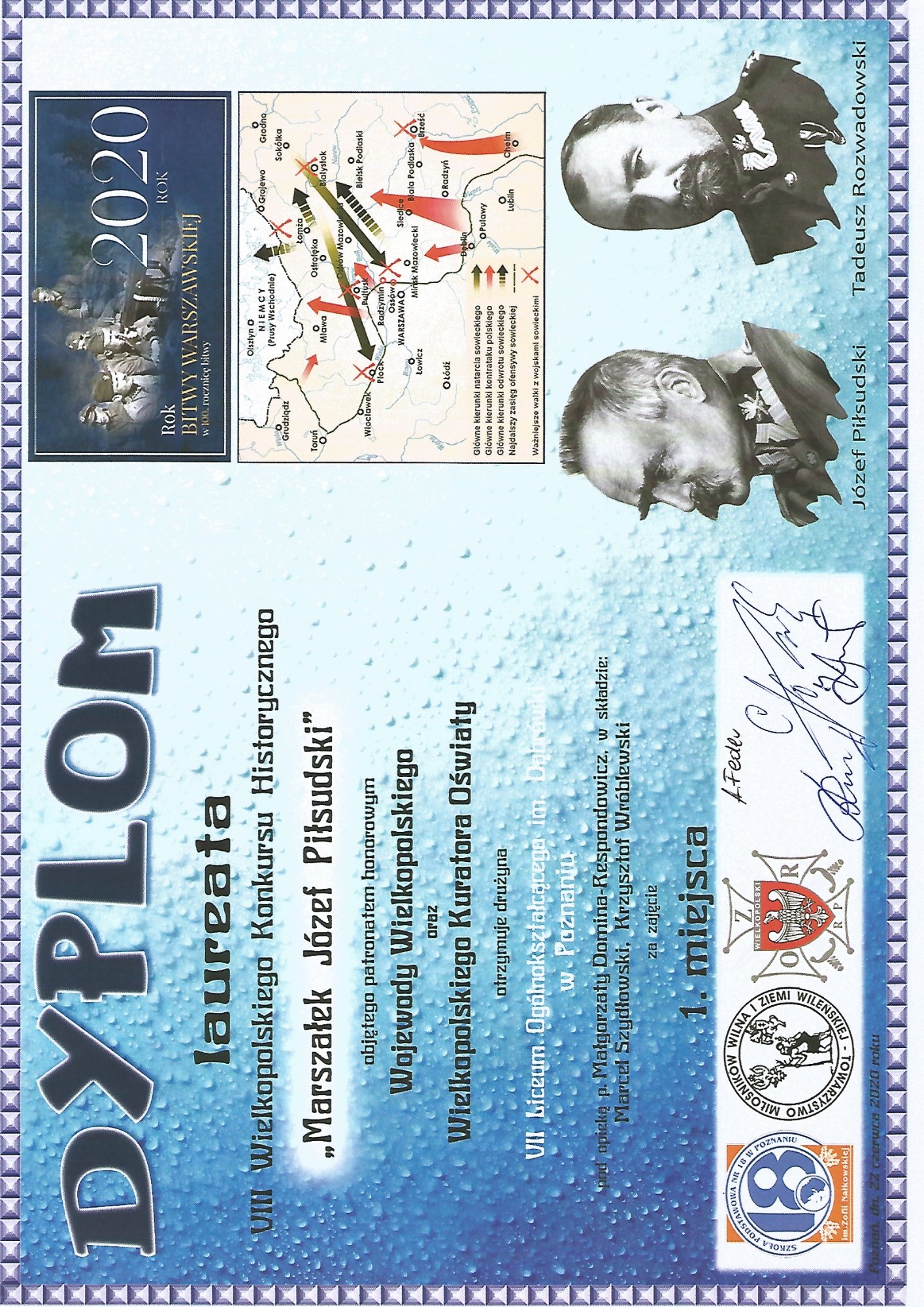 Z dumą i radością informujemy, że nasi uczniowie zostali Laureatami VIII. Wielkopolskiego Konkursu Historycznego „Marszałek Józef Piłsudski” – w grupie wiekowej szkół ponadgimnazjalnych województwa wielkopolskiego.