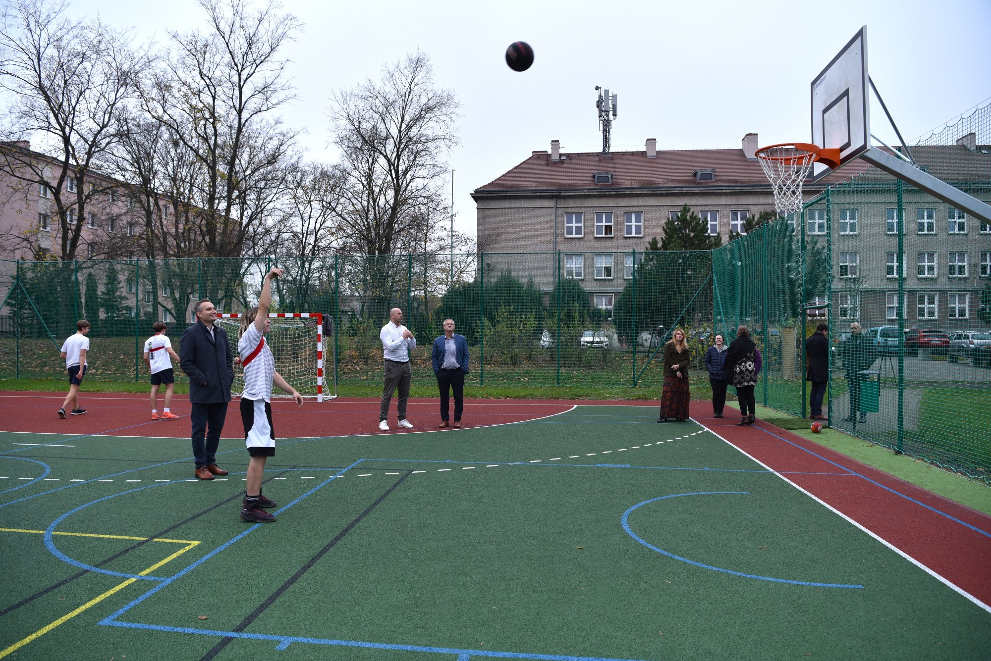 Konferencja prasowa stanowiła też okazję do symbolicznego otwarcia nowego wielofunkcyjnego boiska, które powstało w ramach PBO 2024. Panowie Prezydent, Poseł oraz Dyrektor Szkoły wraz z Uczniami oddawali rzuty do kosza albo rzucali piłką ręczną na odległość, wykonywali rzut Siódmiaka czy „rywalizowali” w rzutach i obronie karnych.