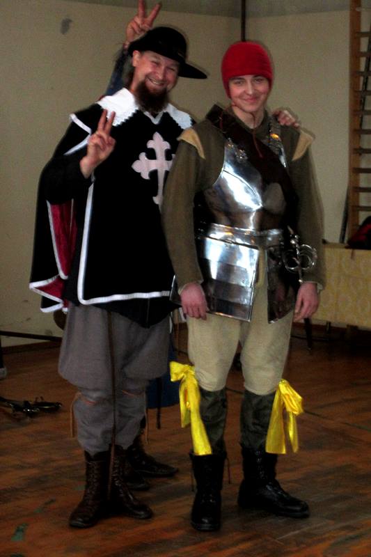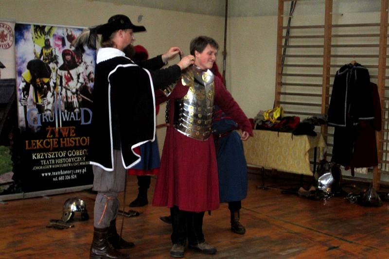 Uczniowie mogli ubrać żupan, kontusz oraz uzbrojenie kawalerii i piechoty: „pancernego”, pikiniera, muszkietera, a także przymierzyć zbroję husarską. Obejrzeli także pokaz walki szablą oraz rapierem w wykonaniu rycerzy Chorągwi. [M.D-R.]