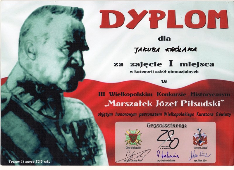 Z dumą informujemy, że nasi uczniowie, Jakub Królak i Karol Maćkowiak z klasy 1GB, zajęli I miejsce w III Wielkopolskim Konkursie Historycznym „Marszałek Józef Piłsudski” – w grupie wiekowej szkół gimnazjalnych województwa wielkopolskiego.