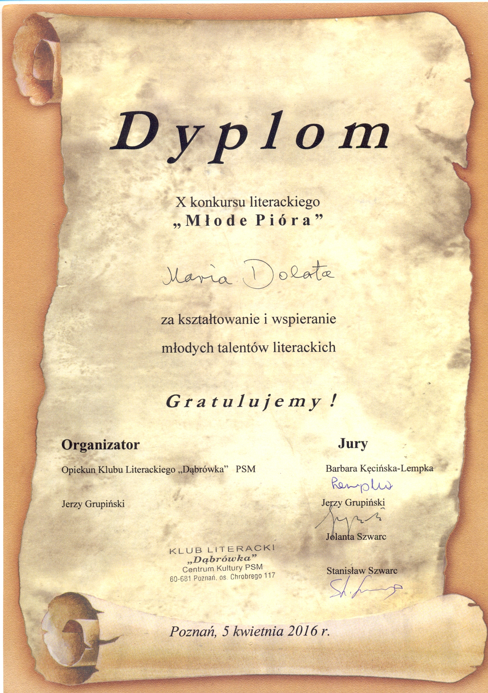zajęła II miejsce w konkursie jednego wiersza „Młodych Piór.