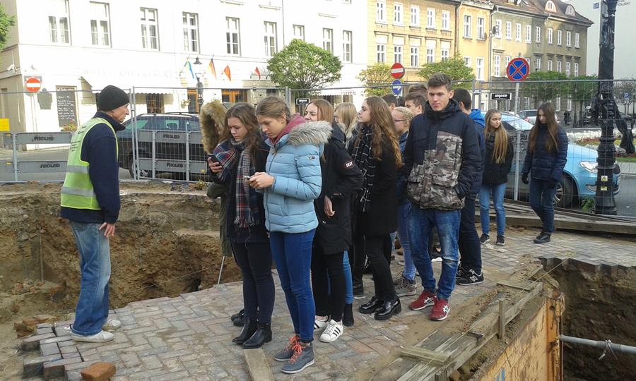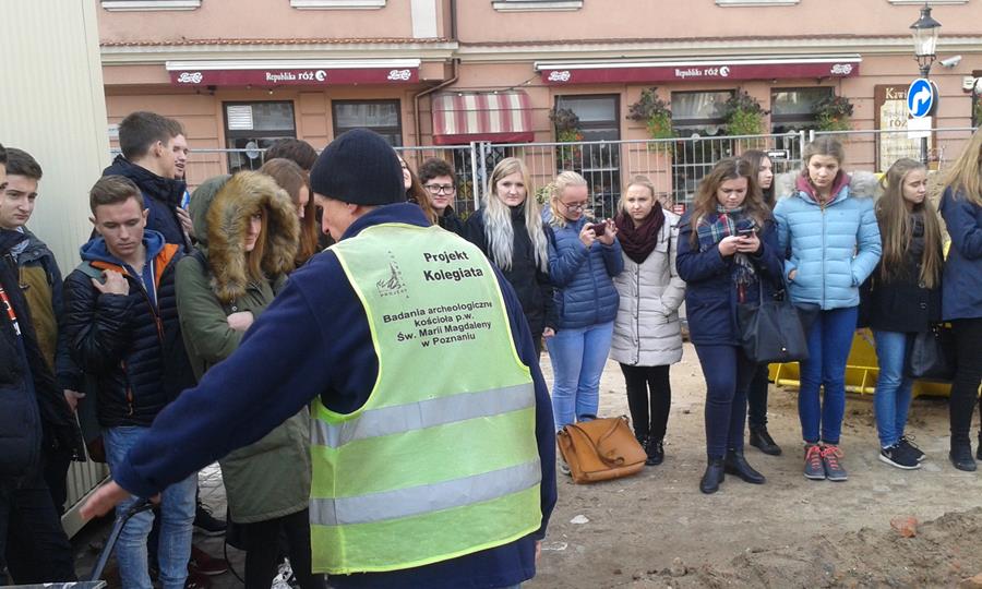 W piątek 4 listopada wraz z Panem Dyrektorem klasa 1A udała się na Plac Kolegiacki, aby zaczerpnąć trochę wiedzy historycznej oraz by zobaczyć wydobyte do tej pory spod ziemi wykopaliska.