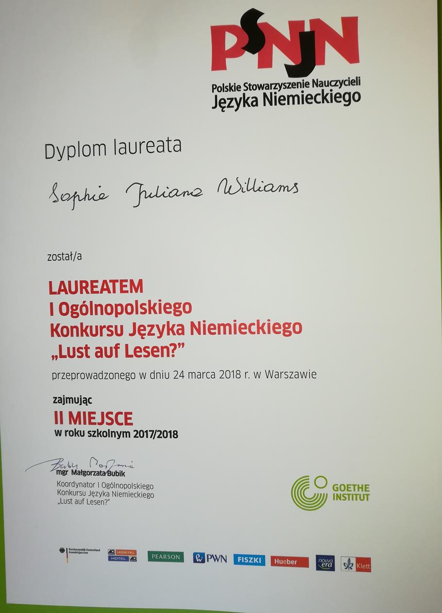 Laureatkami konkursu zostały Sophie Williams i Pola Sarnowska. Spośród laureatów wyłoniono pierwszą trójkę – Sophie zajęła II miejsce! Wśród nagród dla laureatów był też kurs językowy w Niemczech, który przypadł w udziale Poli.