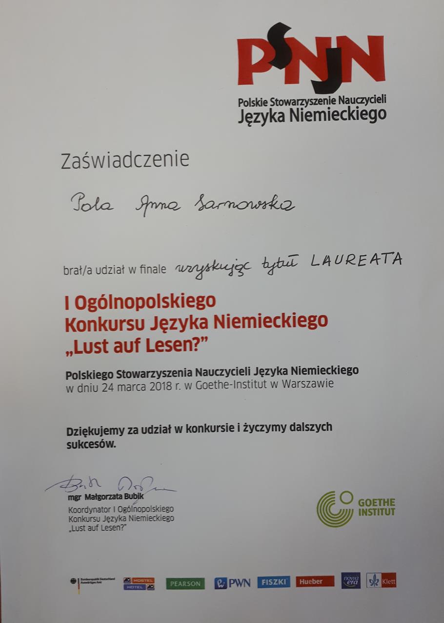 W sobotę, 24 marca, w Goethe-Institut w Warszawie odbył się finałowy etap I Ogólnopolskiego Konkursu Języka Niemieckiego „Lust auf Lesen?”, organizowanego przez Polskie Stowarzyszenie Nauczycieli Języka Niemieckiego.
