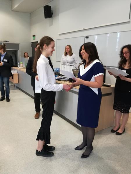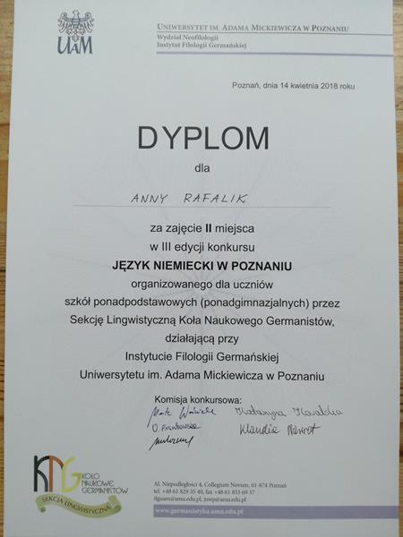 Wśród 34 uczestników znalazła się liczna reprezentacja naszej szkoły w składzie: Anna Rafalik, Lena Witkowska, Antonina Kołpowska, Karol Maćkowiak, Patryk Morawski, Jan Cieśliński, Martyna Gohling, Wiktoria Biela, Adam Nowicki i Gabriela Wojtasik, którzy pod opieką pani prof. Małgorzaty Kraśnik zmagali się najpierw z testem pisemnym, a potem częścią ustną konkursu. Mimo zaciętej rywalizacji podczas etapu pisemnego do ścisłego finału zakwalifikowali się jedynie Anna Rafalik, Lena Witkowska, Patryk Morawski, Adam Nowicki oraz Gabriela Wojtasik. Część ustna pozwoliła na wyłonienie trójki laureatów, do grona których należy reprezentantka naszej szkoły, Anna Rafalik (1e).