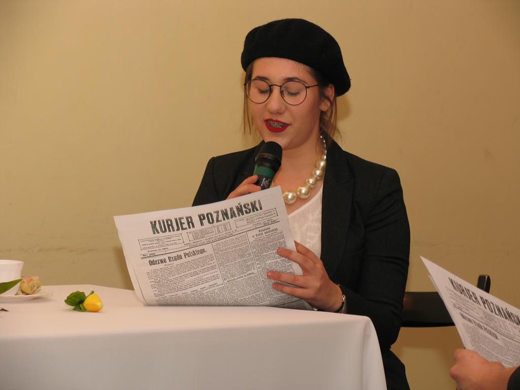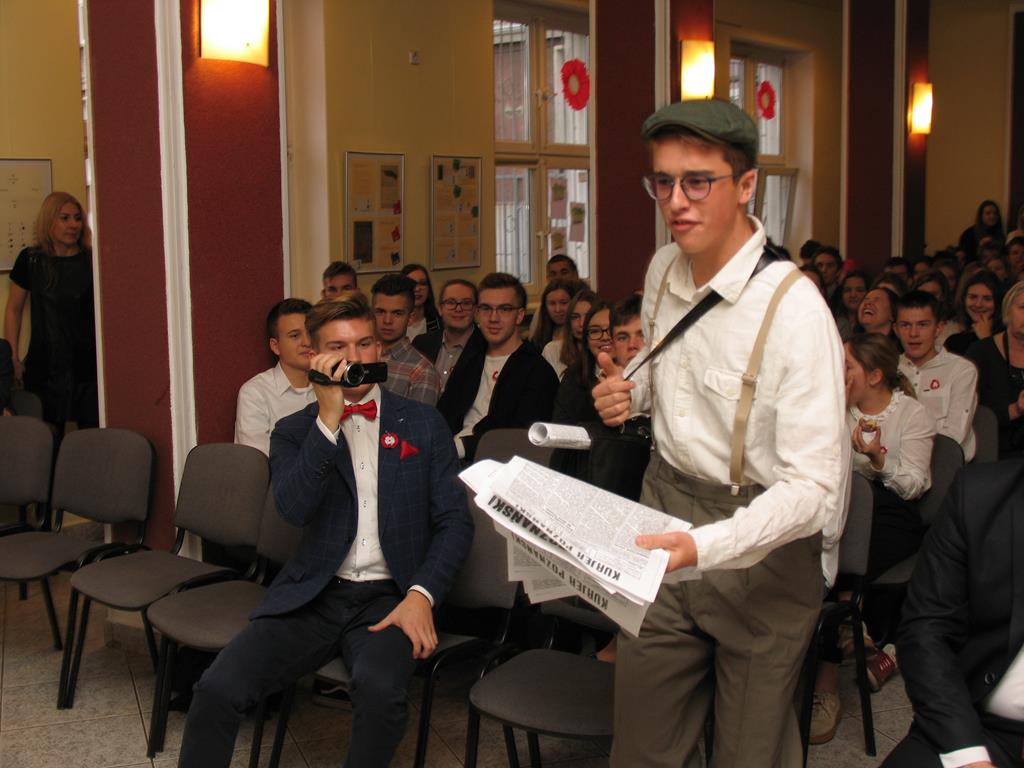 Uczniowie klas pierwszych rywalizowali w konkursie wiedzy o historii szkoły a klasa 2a przedstawiła teatralną inscenizację – przenieśliśmy się do poznańskiej kawiarni z 1918 roku, obserwując reakcje poznaniaków na doniesienia prasowe o ważnych wydarzeniach na arenie międzynarodowej i krajowej.