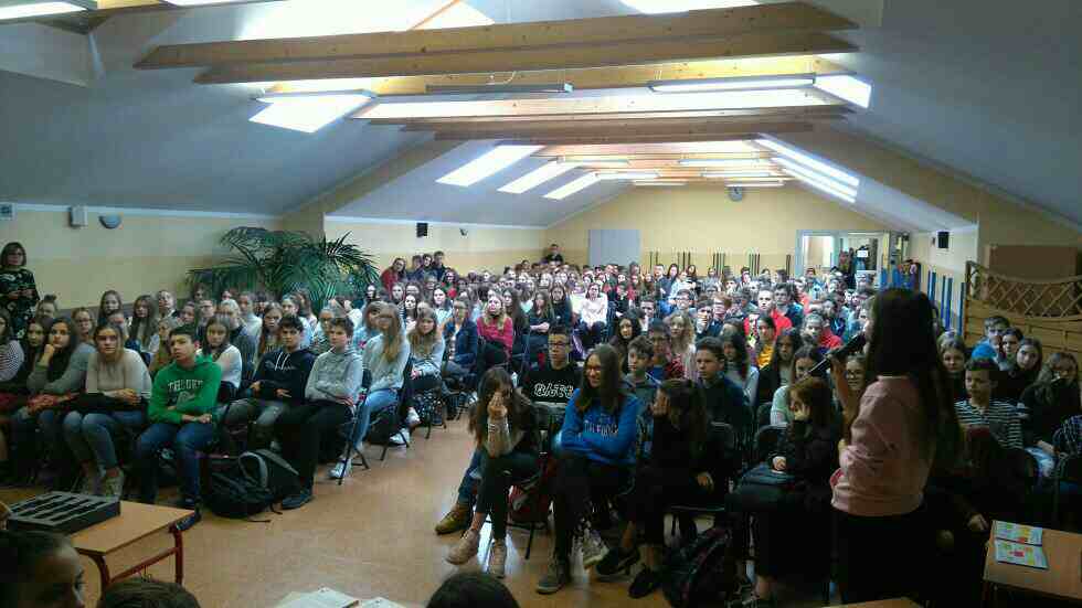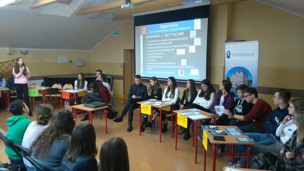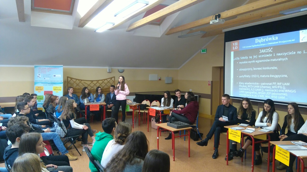Po oficjalnej części przedstawiania szkół uczniowie mogli zadawać nam pytania o to, jaka atmosfera panuje w szkole, czy jakie atrakcje oferuje Dąbrówka. Zachęcaliśmy uczniów do uczestnictwa w rekrutacji do naszej szkoły, pokazując liczne zdjęcia z imprez szkolnych. [Zosia Duszyńska 3c]