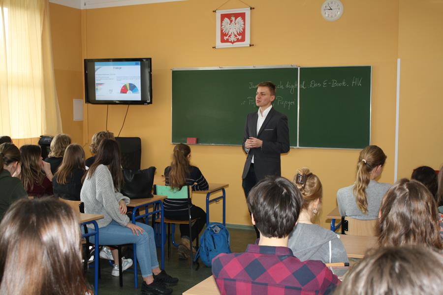 Swoją prelekcję na temat UE zorganizował w związku z nadchodzącymi wyborami do Parlamentu Europejskiego. Dzięki doświadczeniu naszego starszego kolegi poznaliśmy instytucje tworzące Unię Europejską wraz z ich kompetencjami oraz dowiedzieliśmy się, jak funkcjonuje Parlament Europejski. Ponadto Michał zachęcił nas do głosowania w tych wyborach, wyjaśniając dlaczego ważne jest, aby każdy uprawniony obywatel oddał swój głos. Było to uniwersalne przesłanie związane z każdymi wyborami.