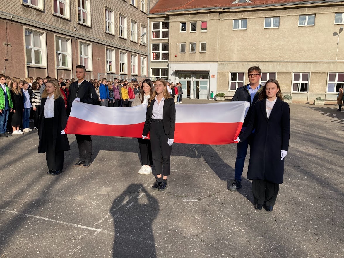 Uroczyste odśpiewanie hymnu państwowego i uczczenie flagi narodowej z okazji Święta Niepodległości.