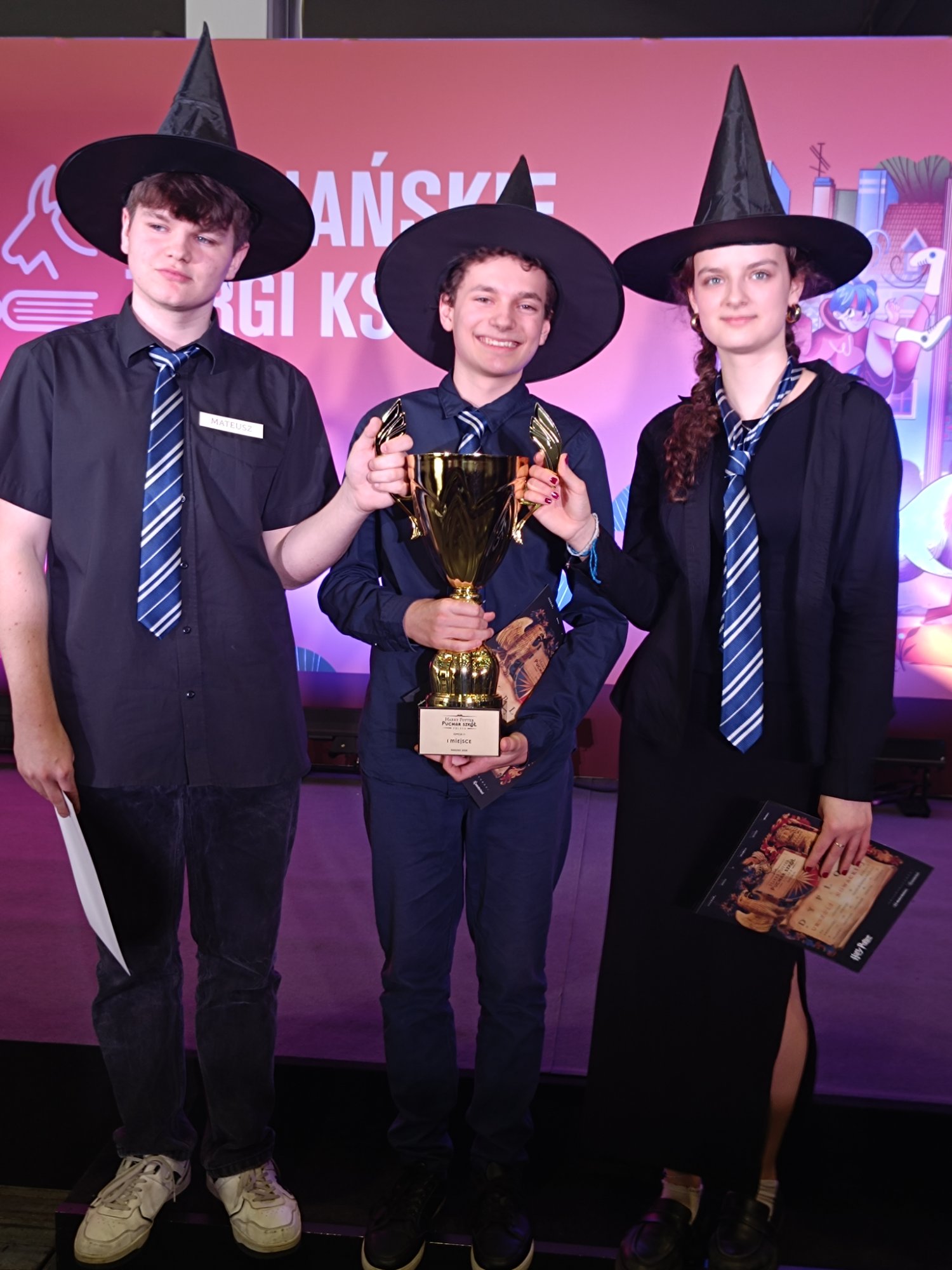 W czasie Poznańskich Targów Książki, 7.03.2025 r., odbył się finał turnieju Harry Potter Puchar Szkół. W ubiegłym roku w Krakowie na Wawelu udało się drużynie Dąbrówki uzyskać piąte miejsce, jednak w edycji tegorocznej nie było lepszych! Spośród dziesięciu zespołów biorących udział w końcowych zmaganiach tylko nasz nie popełnił żadnego błędu i z pełnym zestawem punktów osiągnął zasłużone zwycięstwo. Mateusz Krzyżaniak (3d), Urszula Nowacka (3d) i Wojciech Woszuk (2a) pokonali ponad trzysta drużyn w kilku etapach turnieju, a oprócz zwycięstwa mogą się poszczycić wspaniałymi nagrodami, między innymi zaproszeniami na wystawę światową Harry Potter: Exhibition, która będzie prezentowana pod Krakowem.